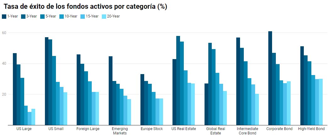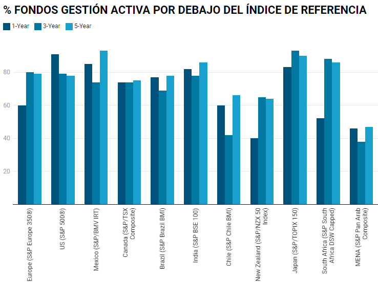 Según los datos del SPIVA® Scorecard, el porcentaje de fondos de gestión activa que no logran batir a su índice de referencia aumenta con el tiempo. Por ejemplo, a nivel global, más del 60% de los fondos de gestión activa no superan a sus índices en un año. Este porcentaje se incrementa a casi el 80% en un plazo de cinco años. Esto indica que, a medida que pasa el tiempo, las probabilidades de que un fondo activo supere a su índice disminuyen drásticamente.